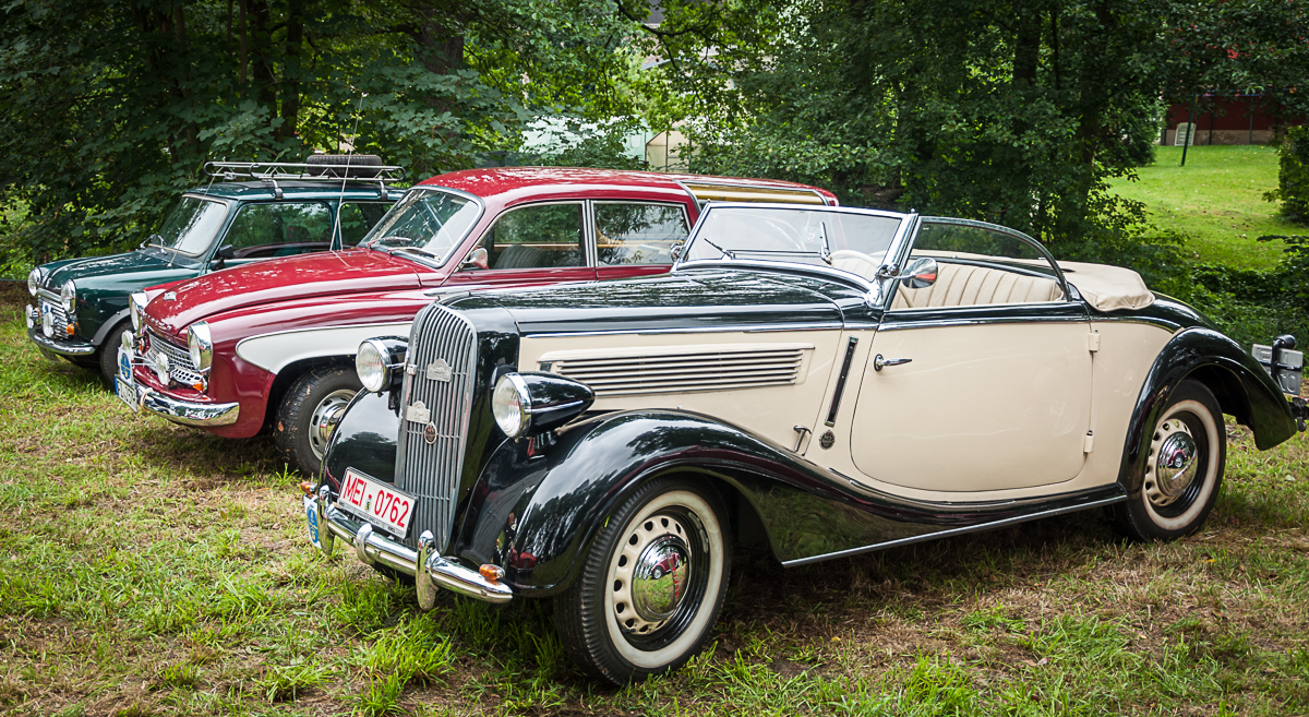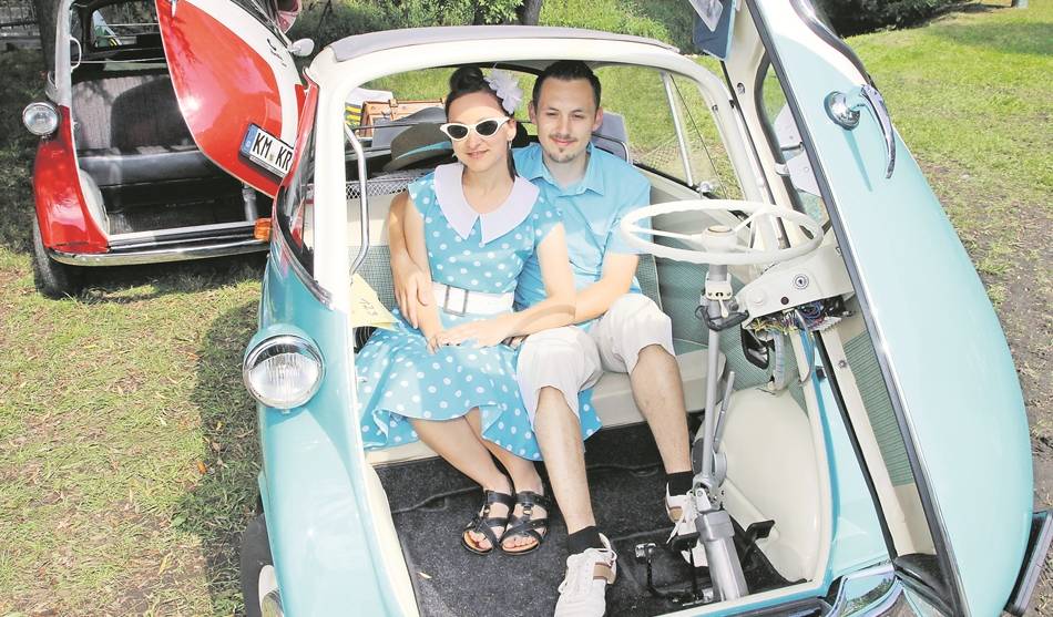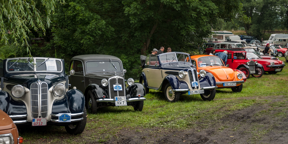 Ein weiterer Blickfang ist der Protos C1 von Bernd Fehrmann aus Dresden. Für Oldtimerfreunde hat der Wagen aus dem Jahre 1923 einen ganz besonderen Zauber. Von dieser Modelreihe sind nur 10 000 Stück hergestellt worden. Besonders schick waren aber auch die zahlreichen BMW-Isetta – im Volksmund auch als „Knutschkugel„ bekannt. Conny und Ralf Dziubanek aus Ottendorf-Okrilla haben ihre Begeisterung für diesen BMW-Typ auch noch optisch in Szene gesetzt: Denn ihre Garderobe spiegelt die Mode der 1960er Jahre wider und passt perfekt zum türkisen Lack ihres Wagens.