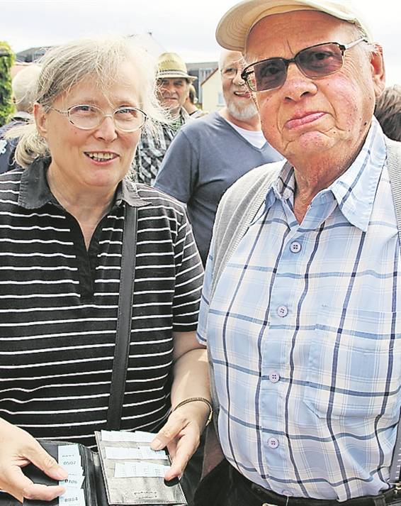 Roland Hering und seine Frau Renate mit den Glückslosen. Insgesamt 25 hatten sie gekauft, um die historische RT zu gewinnen. Es klappte!